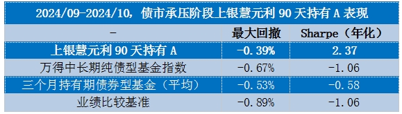 以详细数据为例,2024年9月-10月,风险偏好快速变化导致权益市场虹吸债市资金。在此期间上银慧元利90天持有A最大回撤仅有0.39%,甚至实现2.37的正年化Sharpe。(注:数据来源见下表)