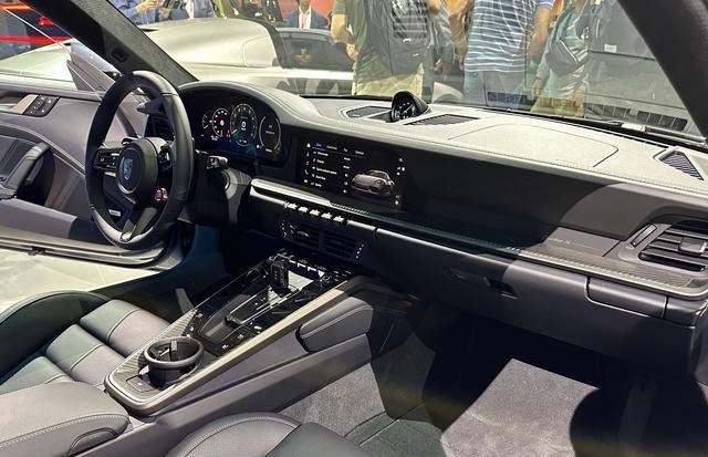 内饰部分,新款 911 Turbo S 延续保时捷运动化座舱风格,中控区域保留经典五连仪表布局,其中中间机械转速表搭配两侧液晶显示屏,显示信息更丰富。10.9 英寸中控屏搭载最新车机系统,操作流畅度与功能丰富度提升,支持无线 CarPlay/Android Auto 互联。车内座椅采用运动桶形设计,材质升级为更高规格的真皮与 Alcantara 拼接,支撑性与包裹性进一步优化,同时座椅加热、通风功能为标配。细节处,方向盘换装全新运动化多功能方向盘,换挡拨片尺寸加大,操作手感更佳,车内还加入碳纤维饰板点缀,进一步凸显运动质感。