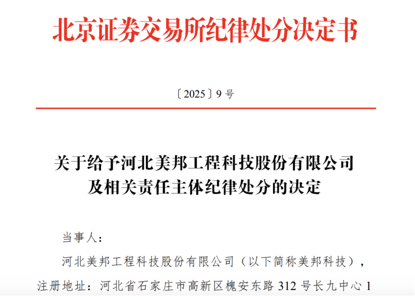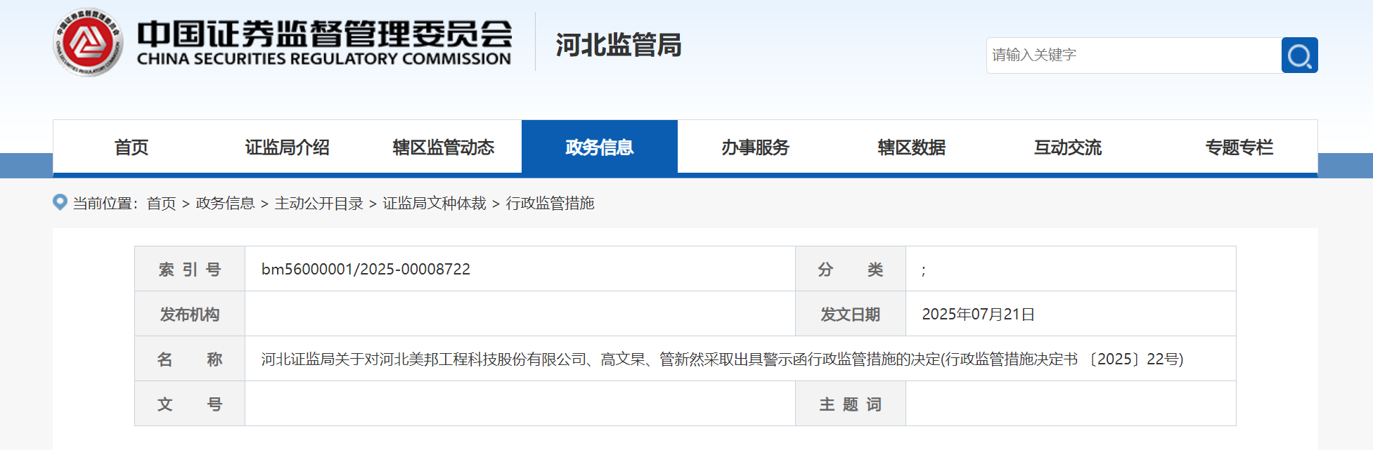 日前,河北证监局发布了关于对河北美邦工程科技股份有限公司(股票简称“美邦科技”,股票代码832471)、高文杲、管新然采取出具警示函行政监管措施的决定(行政监管措施决定书〔2025〕22号)胜亿配资 ,决定书日期为2025年7月21日。
